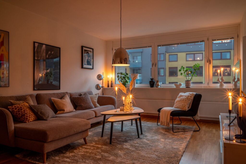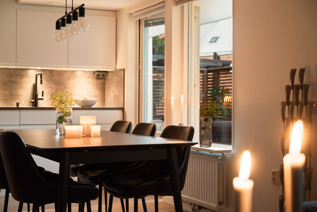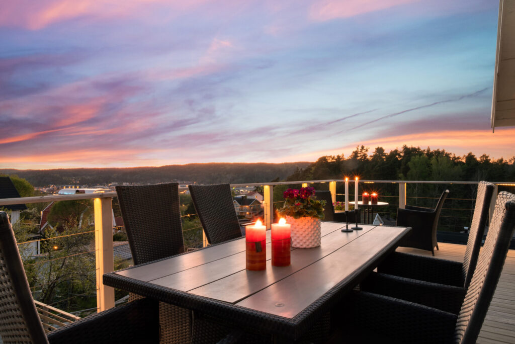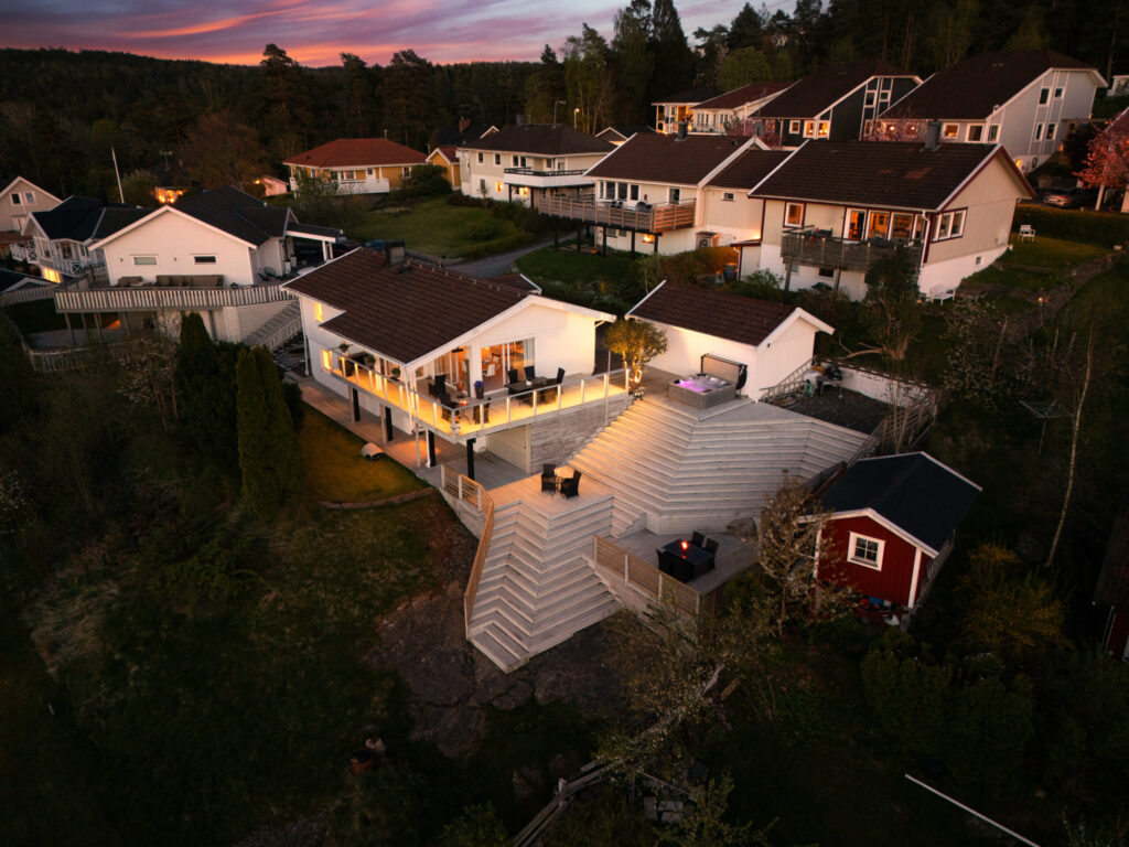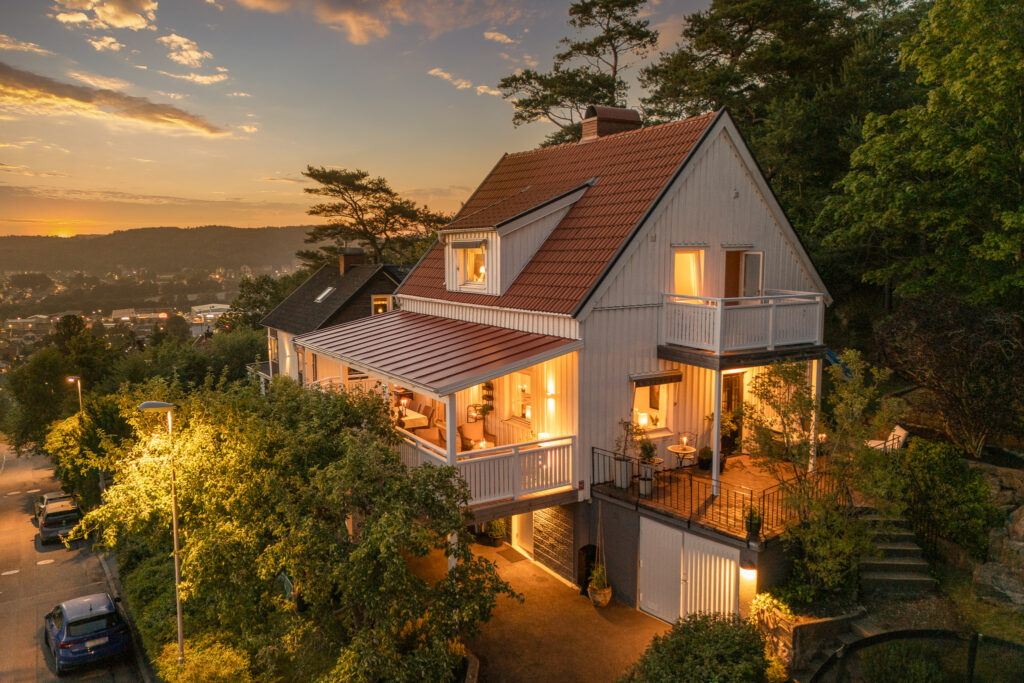 Skymningsbilder skapar en unik stämning där solnedgångens mjuka ljus framhäver bostadens karaktär och ger den ett varmt, levande uttryck.